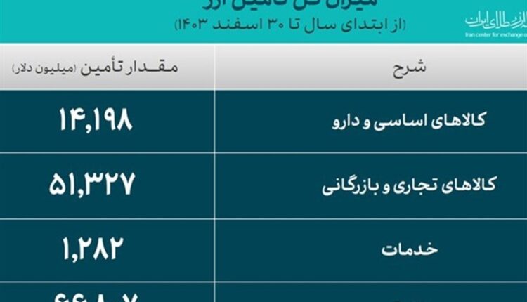 به گزارش خبرگزاری صابرین نیوز به نقل از روابط عمومی بانک مرکزی، از ۶۶.۸ میلیارد دلار ارز تامین شده، حدود ۱۴.۱ میلیارد دلار آن بابت ارز مورد نیاز کالاهای اساسی و دارو، ۵۱.۳ میلیارد دلار برای صنایع و ۱.۲ میلیارد دلار ارز موردنیاز خدماتی بوده است.