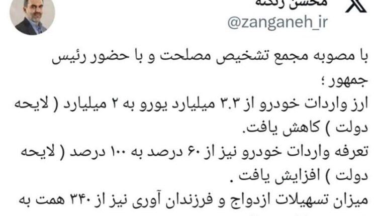 به گزارش خبرگزاری صابرین نیوز، محسن زنگنه نماینده مجلس در فضای مجازی نوشت: «با مصوبه مجمع تشخیص مصلحت و با حضور رئیس جمهور، ارز واردات خودرو از 3.3 میلیارد یورو به 2 میلیارد یورو کاهش یافت.