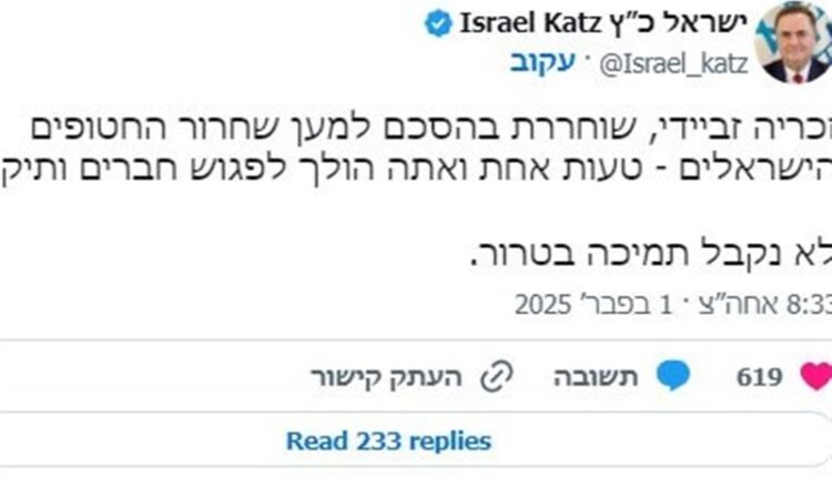 به گزارش گروه عبری خبرگزاری صابرین نیوز، پایگاه خبری روزنامه معاریو در خبری در این رابطه اعلام کرد، یسرائیل کاتس وزیر جنگ اسرائیل در تویتی که امروز شنبه در صفحه خود در ایکس (تویتر سابق) منتشر کرد، ذکریا الزبیدی را تهدید کرد و برای او نوشت، تو در چارچوب توافق مبادله گروگانهای اسرائیلی آزاد کردیم، فقط یک اشتباه کافی است که تو به دوستان قدیمیات ملحق شوی ما هر نوع حمایت از تروریسم!! را تاب نمیآوریم.