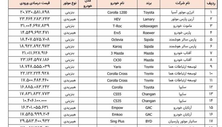 ۱- قیمتهای مندرج در جداول قیمت در مبادی ورودی کشور بوده و هزینهها و عوارض قانونی پس از ترخیص از قبیل بیمه شخص ثالث، مالیات بر ارزش افزوده، هزینههای شمارهگذاری، اسقاط خودروی فرسوده، کرایه حمل و… قابل اضافه شدن به قیمتهای مذکور است.