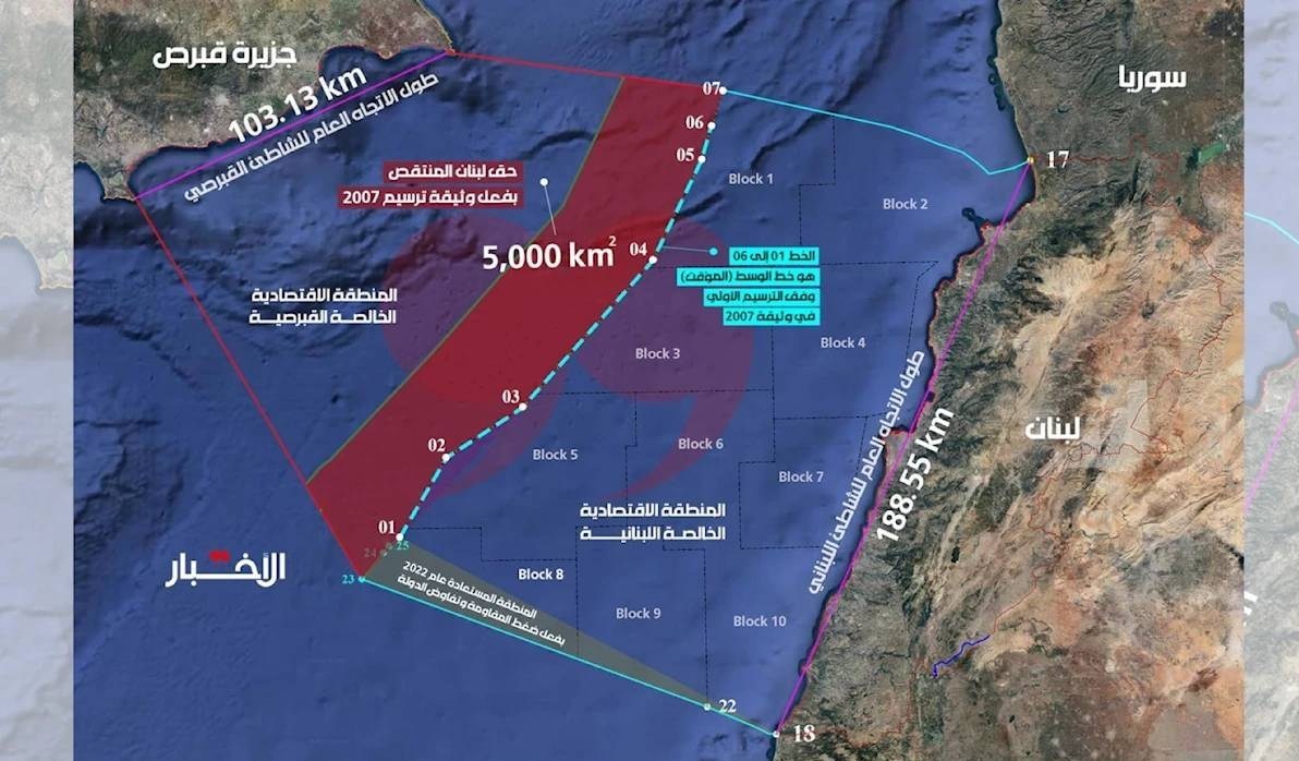 روزنامه الاخبار لبنان در این زمینه به طرح خطرناک جدید آمریکا برای تقدیم کردن ۵۰۰۰ کیلومتر مربع از منابع ثروتهای لبنان به قبرس اشاره کرده بود و در گزارش جدید خود به این منظور اعلام کرد که کمیته تعیین مرزهای دریایی لبنان با قبرس، با سرعتی بیسابقه که تنها در راستای پاسخ به خواستههای خارجی و انجام تعهدات تحت قیمومیت آمریکاست، مذاکرات رسمی خود را با قبرس طبق توافق مشکوک سال 2007 که حقوق دریایی معادل نیمی از مساحت لبنان را واگذار میکرد، به انجام رساند.