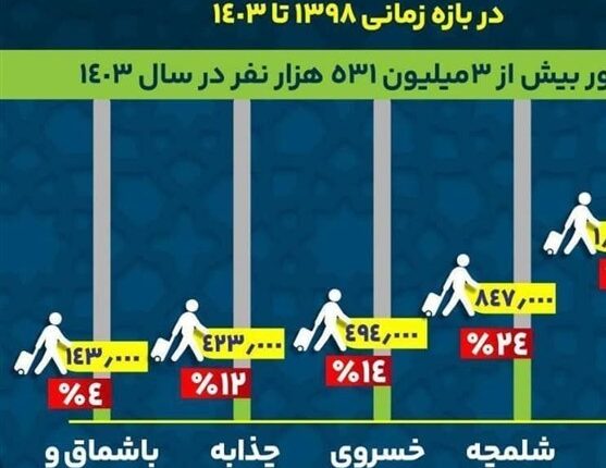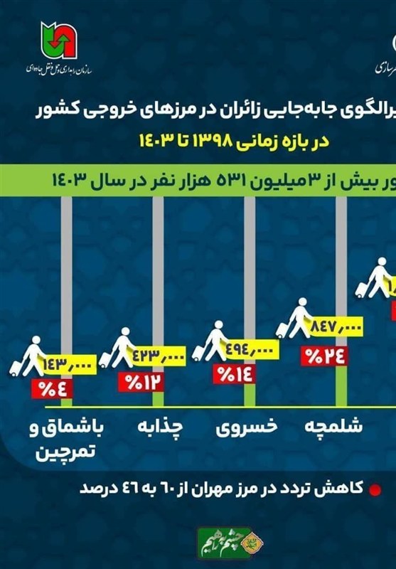 سال ۱۴۰۳ حدود ۳ میلیون و ۵۳۱ هزار نفر از ۶ مرز زمینی کشور خارج شدند. بر این اساس تعداد یک میلیون و624 هزار نفر از مرز مهران و 847 هزار زائر از مرز شلمچه خارج شدند که به ترتیل معادل 46 و 24 درصد کل زائران بوده است.