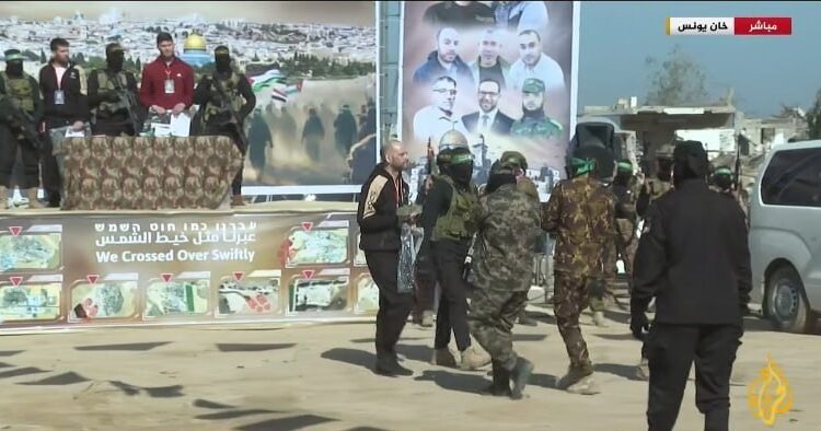 رزمندگان القسام در مراسم تحویل اسرای صهیونیست در خان یونس واقع در جنوب نوار غزه، با سلاحهایی که در عملیات 7 اکتبر 2023 تحت عنوان طوفان الاقصی از صهیونیستها به غنیمت گرفته بودند حاضر شدند.