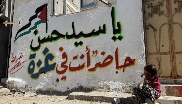 تکریم شهید سید حسن نصرالله روی دیوارهای شکسته و به خون نشسته غزه
