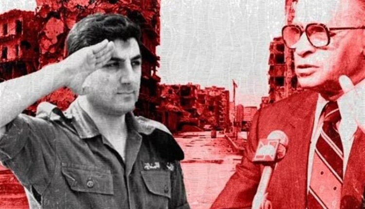 بشیر الجمیل مؤسس و فرمانده کتائب، فرمانده اشغالگر اسرائیلی را در آغوش کشیده است