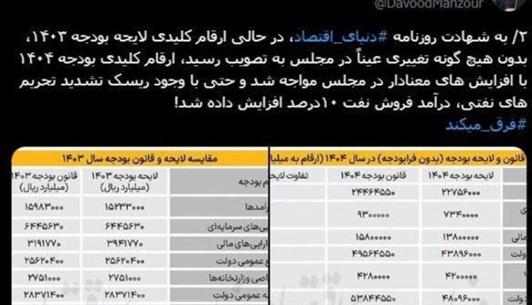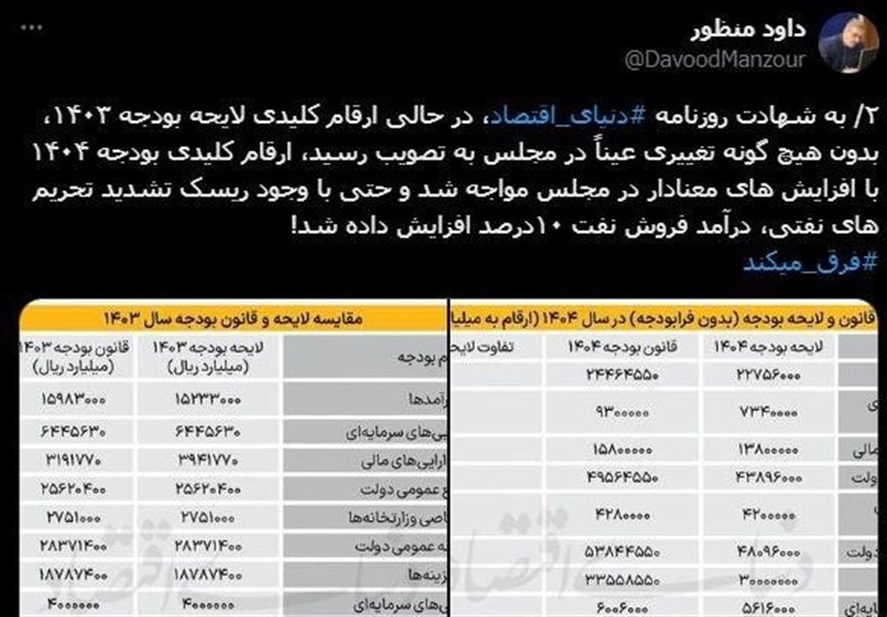 به شهادت روزنامه دنیای اقتصاد، در حالی ارقام کلیدی لایحه بودجه ۱۴۰۳، بدون هیچ گونه تغییری عیناً در مجلس به تصویب رسید، ارقام کلیدی بودجه ۱۴۰۴ با افزایش های معنادار در مجلس مواجه شد و حتی با وجود ریسک تشدید تحریم های نفتی، درآمد فروش نفت ۱۰درصد افزایش داده شد!