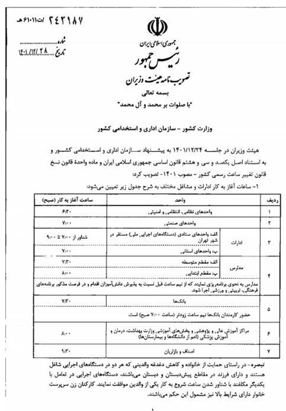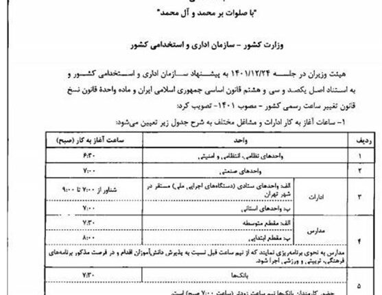 به گزارش خبرگزاری صابرین نیوز به نقل از مرکز روابط عمومی سازمان اداری و استخدامی کشور، سیدمحمد شفیعی؛ سخنگوی این سازمان اعلام کرد: ساعات آغاز به کار دستگاههای اجرایی کشور از 16 فروردینماه 1404 بر اساس تصویبنامه هیئت وزیران در تاریخ 1401/12/28 به شماره 243187/ت 61011 هـ تعیین میشود.