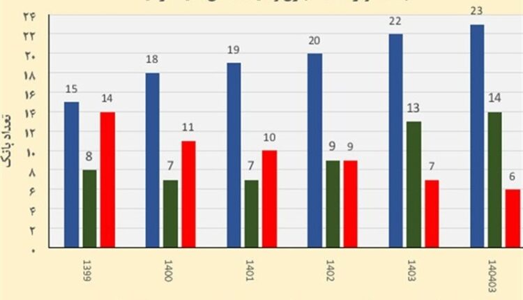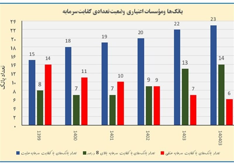 مطابق نمودار فوق، بانکهای با کفایت سرمایه منفی از 14 بانک در سال 1399 به 6 بانک در خرداد سال جاری کاهش یافته است. از سوی دیگر تعداد بانکهای دارای کفایت سرمایه مثبت نیز در دوره مشابه از 15 بانک به 23 بانک افزایش یافته است. از منظر حدود مقرراتی نیز افزایش تعداد بانکهای با کفایت سرمایه بالای 8 درصد از 8 بانک در سال 99 به 14 بانک در خرداد 1404 مطلوب ارزیابی میگردد.
