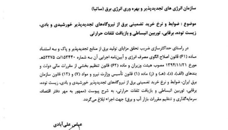 به گزارش خبرگزاری صابرین نیوز، عباس علیآبادی، وزیر نیرو، در نامهای به سازمان انرژیهای تجدیدپذیر و بهرهوری انرژی برق (ساتبا)، ضوابط و نرخ خرید تضمینی برق از نیروگاههای تجدیدپذیر خورشیدی، بادی، زیستتوده، توربین انبساطی و بازیافت تلفات حرارتی تا ظرفیت حداکثر 10 مگاوات را اعلام کرد.