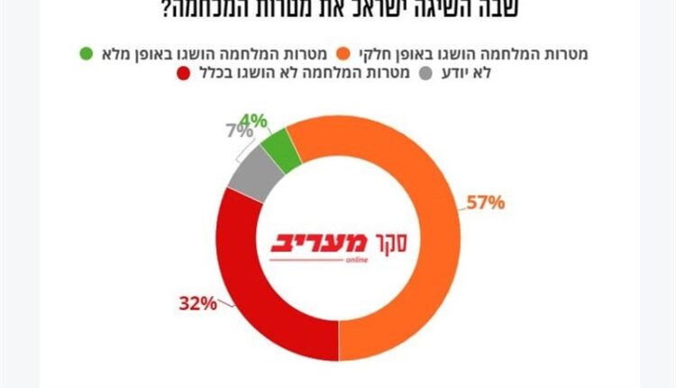 به گزارش گروه عبری خبرگزاری صابرین نیوز، براساس نتایج نظر سنجی روزنامه معاریو از صهیونیستها، فقط 4 درصد از اسرائیلیها بر این باور هستند که اهداف جنگ در نوار غزه به طور کامل محقق شده است و در مقابل 57 درصد نظری مخالف با آن دارند.