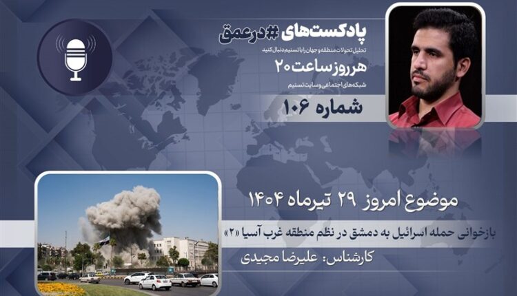 گروه بینالملل خبرگزاری صابرین نیوز ـ یکصدوششمین شماره از پادکست «در عمق» که به بررسی مهمترین روندها، تحولات و همچنین شخصیتها در غرب آسیا میپردازد، روز یکشنبه 28 تیر ماه 1404 ضبط و منتشر شد. در این شماره «علیرضا مجیدی»، کارشناس مسائل غرب آسیا به بررسی حملات اخیر رژیم صهیونیستی به دمشق و بقیه مناطق این کشور میپردازد.